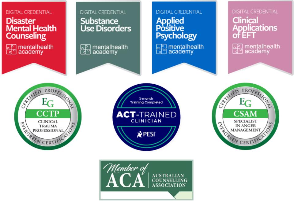 I hold a Master’s Degree in Counselling, with a specialisation in Mental Health Counselling. Additionally, I am a Certified Clinical Trauma Professional [CCTP], an Accredited Disaster Mental Health Counsellor, a Certified Specialist in Anger Management [CSAM], an ACT-Trained Clinician, and a registered member of the Australian Counselling Association.